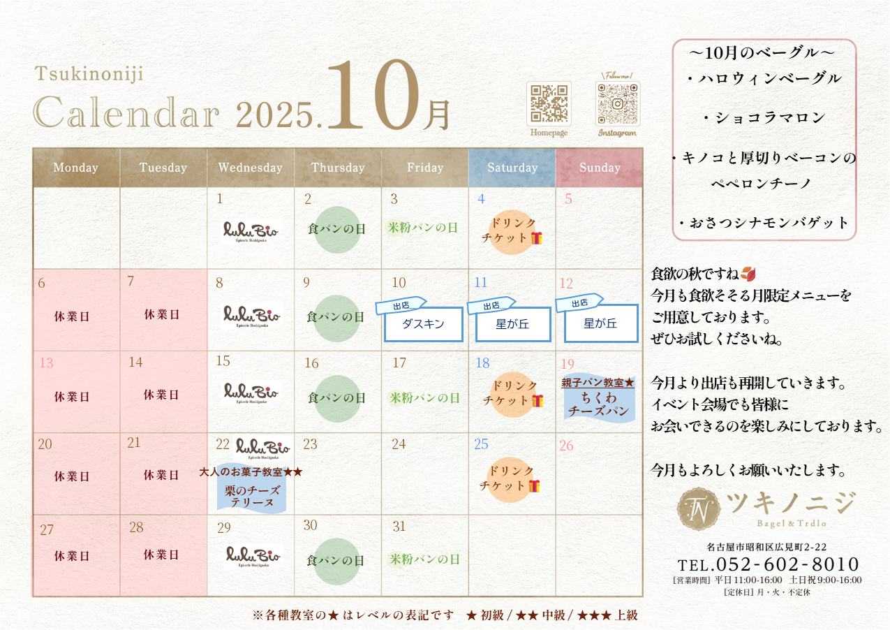 News 2025.09.30 10月ツキノニジカレンダー 10月のツキノニジカレンダーを公開しました。 10月のベーグルはこちらの3種です。 ・ハロウィンベーグル ・ショコラマロン ・キノコと厚切りベーコンのペペロンチーノ 秋らしいベーグルになってます。 人気のメニューはサクリでのお取り置きが オススメです。 また、先月は日曜日にお休みをいただき ご不便おかけし申し訳ございません。 今月は営業になりますので、 ご来店お待ちしております。 では、皆様とお会いできるのを スタッフ一同楽しみにしております。